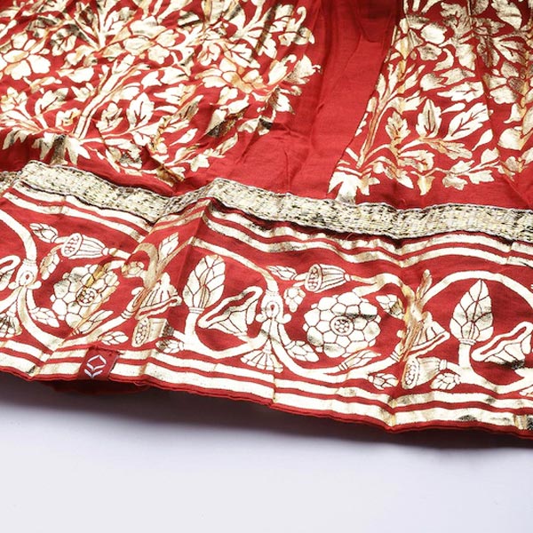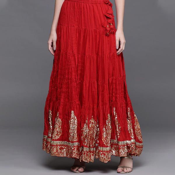 Red printed flared maxi skirt, has a elasticated waistband, comes with a latkan and gotapatti detailing