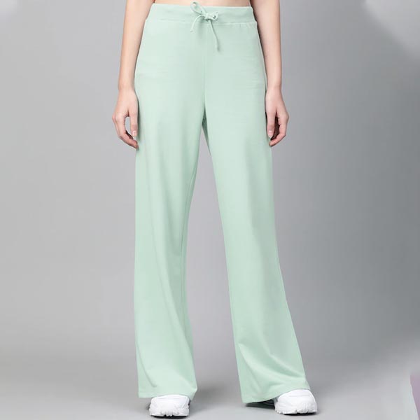 A pair of mint green solid wide leg track pants, has an elasticated waistband with outer drawstring closure