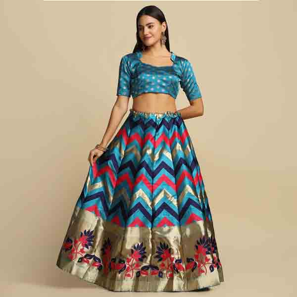 lehenga fabric: jacquard silk || inner fabric: crepe || choli fabric: jacquard silk || dupatta fabric: jacquard silk || lehenga length: 42 inch || choli size: 0.8 mtr || dupatta width: 38 inches/ 0.95 meter , dupatta length : 2.15 meter/ 84.64 inches|| lehenga work: gold woven work || choli work: woven work || dupatta work: gold woven work